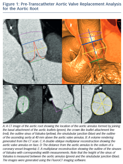 a, coronary arteries ostia and any bypass grafts should be assessed in all patients considered for TAVR.5 While 2D echocardiography provides valuable haemodynamic information and is readily available, a MSCT-based analysis of the aortic root and vascular access sites has become a sine qua non step in the pre-operative evaluation of patients for TAVR.6 Device sizing using multi-slice computer tomography (MSCT) has been shown to offer more precise measurements of the aortic root than echocardiography and thus reduces rates of paravalvular leak (PVL),7–10 an independent predictor of post-operative mortality from 30 days to 2 years.11–20