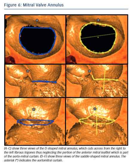 In the context of transcatheter mitral valve replacement (TMVR), MSCT has been proposed to quantify the mitral valve annulus. The mitral valve annulus is often described as either saddle-shaped or as D-shaped (see Figure 6). It has been argued that for some of the devices, in particular those that are not axially symmetrical, the D-shaped annulus may be more appropriate for sizing purposes.59,60 This question remains to be studied, but in the interim we suggest that both techniques be