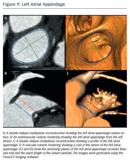 MSCT allows the anatomy of the LAA to be evaluated, which is valuable for device selection,79 assessment of procedural success and longer-term outcomes.80 It has been suggested that the perimeter-derived diameter of the LAA ostium is the most appropriate for device sizing.79 Other important parameters include the minimum and maximum diameters, as well as the waist length of the LAA ostium81 (see Figure 9). MSCT can also be used to determine optimal fluoroscopic angulation for the deployment of the LAA closure device.31