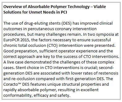 Although the latest polymeric drug-eluting stents (DES) have enhanced percutaneous coronary intervention (PCI) procedures, a substantial proportion of patients requiring percutaneous transluminal coronary angiography (PTCA) is elderly with numerous different comorbidities. This population requires use of effective DES that can minimise the risk of bleeding and/or thrombosis. Two symposia were held at EuroPCR, the official congress of the European Association of Percutaneous Cardiovascular Interventions, in Paris on 19–22 May 2015, with the objectives of sharing clinical experiences in the use of absorbable polymer stents and to understand why an absorbable polymer DES may be specifically indicated in PCI subsets such as chronic total occlusions (CTOs) or tortuous coronary anatomies. To meet these clinical challenges, a novel DES was discussed: Coracto™ (Alvimedica) is a DES with a unique design that elutes sirolimus from an absorbable poly(lactic-co-glycolic acid) (PLGA) polymer.