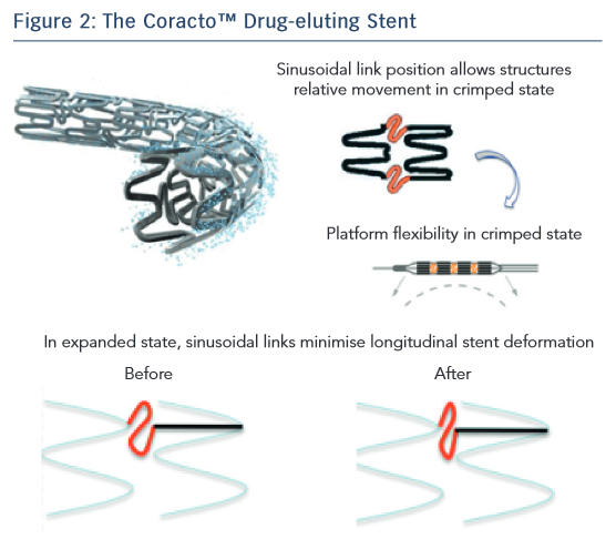 scularisation and restenosis. However, a DES has specific requirements when treating CTO; these include deliverability, stent matching to the vessel and good clinical results at follow-up. In terms of delivery, the Coracto DES features optimised geometry in the ‘crimped’ state owing to its sinusoidal link position that allows flexibility (see Figure 2), thin stent struts (a total strut thickness of 88 μm, lower than other currently available DES) and an optimised delivery system. Next, Dr Garbo considered stent matching to the vessel. The Coracto DES also features optimised geometry in its expanded state, a result of its sinusoidal link shape. Another important consideration is elastic recoil, i.e. the natural reduction in diameter of the stent after deflation of the balloon due to the elasticity of the stent material. Most DES are formed of cobalt-chromium, which has an average recoil of 5–6 %. The Coracto DES is made of stainless steel, which has an average recoil of only 2–3 %.11 Stent recoil has been identified as a significant predictor of late lumen loss (LLL).12 Longitudinal stent deformation is also a crucial factor in matching a stent to a vessel. The sinusoidal shape of the links in the Coracto stent minimises longitudinal deformation. The stent has a maximum expanded cell diameter of 4.0 mm, making it ideal for side-branch crossing.11 Finally, the Coracto DES is designed to optimise clinical outcomes. Preclinical studies indicated that the polymer of the Coracto DES provides controlled release of rapamycin (sirolimus), and degradation of the polymer is completed within 8–10 weeks, leaving a BMS (see Figure 3).13