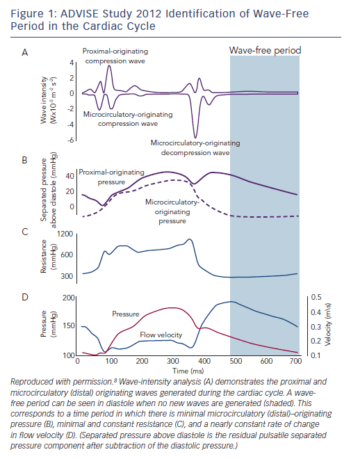 iFR was first described in 2011 following a proof-of-concept study in 157 coronary stenoses in which FFR was compared with resting (non-hyperaemic) trans-stenotic pressure gradients measured in a time period beginning 25 % into diastole and ending 5 ms before the onset of systole, the ‘wave-free’ period.9 It was proposed that coronary microcirculatory resistance was already constant in this window and as low as whole-cycle resistance during hyperaemia (Figure 1). In theory, this should allow accurate prediction of FFR, and in this initial study iFR was found to have a strong correlation with FFR with a receiver operating characteristic area under the curve (ROC AUC) of 93 % for iFR≤0.83 predicting FFR≤0.80.9 For decision making in the cath-lab, the investigators proposed that an iFR value of 0.83 could be equated to an FFR value of 0.80.