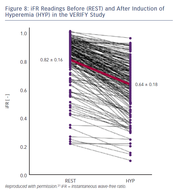 iFR assumes that microvascular resistance is already constant and minimal in the wave-free period. Both the VERIFY study and the analysis from Johnson et al. clearly demonstrate that this is not the case.22,34 In the VERIFY study, average iFR values fell significantly following the induction of hyperemia from 0.82 ± 0.16 versus 0.64 ± 0.18 with hyperaemia (95 % CI 0.17–0.20; p=0.0001). At an individual level, iFR decreased with hyperaemia in 97 % of the lesions studied (Figure 8). In the study by Johnson et al, myocardial resistance during the diastolic wave-free period, calculated from simultaneous pressure and flow data, was 250 % higher at rest than during hyperaemia.34 The authors recommend that if clinicians have access to iFR in their cath-labs they should measure at rest and again during hyperaemia; this will make it abundantly clear that it is not, as advertised, an ‘adenosine-independent index of stenosis severity’.