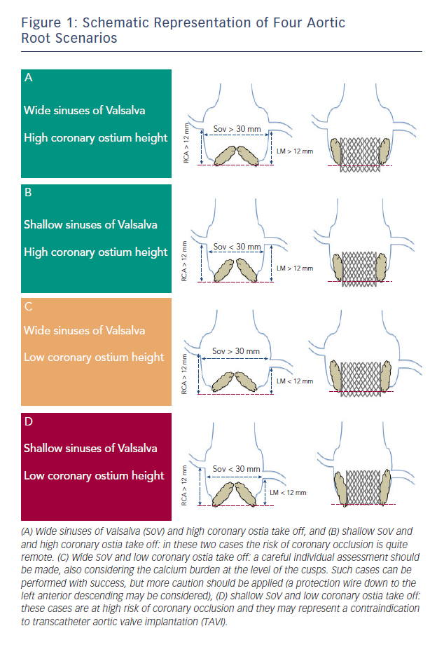 In both cases there are some anatomic features (narrow sinus of Valsalva, bulky leaflet calcifications, low-lying coronary ostia) that have been involved in its pathogenesis (see Figure 1). In a multicentre study enrolling 44 patients who suffered symptomatic coronary occlusion among a large series of 6,688 TAVIs, Ribeiro and colleagues demonstrated that lower-lying coronary ostium (<12 mm) and shallow sinuses of Valsalva (<30 mm) were the strongest anatomic factors associated with coronary obstruction.8 Nevertheless, the risk of coronary occlusion remains difficult to assess, and no definite criteria exist to exclude patients deemed at high risk. However, this study suggests that greater caution should be applied when we are dealing with patients candidate to TAVI having such anatomical features.