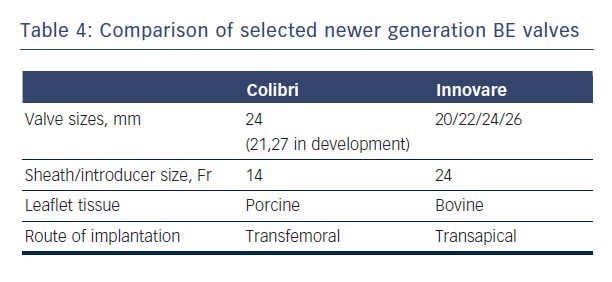 The Colibri valve is a low-profile (14-Fr) pre-crimped, and pre-packaged ready-for-use BE valve made of three independent pieces of porcine pericardium, which are created using a unique folding method and sewn into a stainless steel laser-cut frame. Another newer BE valve is the Innovare valve (Braile Biomedical, Brazil), which consists of a trileaflet bovine pericardial valve mounted in a cobalt-chromium alloy, available in sizes of 20/22/24/26 mm (see Table 4).43