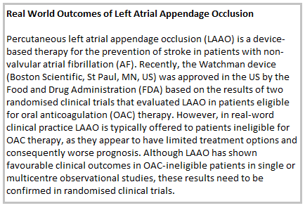 Today, the main controversy about LAAO relates to the absence of randomised clinical trial evidence evaluating its safety and efficacy in patients with contraindications to OAC therapy: the Watchman device was assessed in warfarin-eligible patients. In OAC-contraindicated patients, there remain however limited or no options that provide adequate stroke prevention. These patients present significant healthcare and social problems, especially the more elderly cohorts that suffer cardioembolic stroke.19 The most recent European Society of Cardiology (ESC) Guidelines on the management of AF suggest that “Interventional, percutaneous LAA closure may be considered in patients with a high stroke risk and contraindications for long-term oral anticoagulation” (IIb indication, Level of evidence B).20 Furthermore, the 2014 ESC/European Association of Cardio-Thoracic Surgeons Guidelines on myocardial revascularisation state that “Percutaneous LAA closure and antiplatelet therapy may be considered in patients with atrial fibrillation undergoing PCI if a high stroke risk and contraindication for long-term combined antiplatelet + oral anticoagulation therapy is present” (IIb indication, Level of evidence B).21 In fact, these guidelines reflect the use of LAAO in the real world. In a 22-centre, non-randomised study that included 1,047 patients who underwent LAAO with the ACP device, the most common indication for LAAO were (1) previous major bleeding (4 7%), followed by (2) high risk for bleeding (35 %), and (3) avoidance of triple (dual antiplatelet + OAC) therapy for coronary artery disease and coronary stenting (22 %).14 In the ASA Plavix Feasibility Study With Watchman Left Atrial Appendage Closure Technology (ASAP) study, a non-randomised evaluation of the Watchman device in patients with a contraindication to OAC therapy, a history of haemorrhagic/bleeding tendencies was the most common reason for warfarin ineligibility (93 %).13 Nevertheless, it should be noted that currently there is no universally accepted definition of contraindication to OAC therapy, so in the real world the criteria for offering LAAO vary significantly between centres.