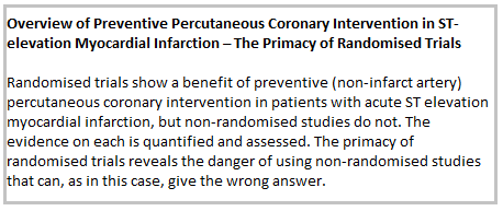A limitation of the trials of preventive PCI, as in all randomised trials, is that they only provide an average effect of treatment. Some patients will benefit more from preventive PCI than others, but in the absence of knowing who they are, no special selection can be recommended. The trials excluded patients with cardiogenic shock, previous coronary artery bypass graft (CABG), significant stenosis of the left main stem or in whom the only non-infarct artery disease was a chronic total occlusion. Therefore, while the benefits of preventive PCI may apply in these selected groups, there is uncertainty. In others, for whom the non-infarct artery stenoses are judged treatable by PCI, the evidence from the trials completed so far, is clear – that immediate preventive PCI confers substantial clinical benefit. The primacy of randomised trials reveals the danger of using non-randomised studies, which can, as in this case, give the wrong answer.