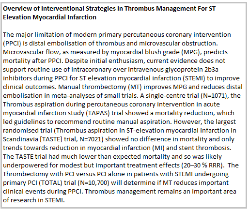 The ongoing randomised trial of routine aspiration Thrombectomy with PCI versus PCI alone in patients with STEMI undergoing primary PCI (TOTAL) is an event driven trial that will recruit 10,700 patients. The primary outcome will be cardiovascular death, MI, cardiogenic shock and class IV heart failure up to 180 days.30 The hypothesis of the trial is that by reducing thrombus burden at site of stent implantation, thrombectomy can prevent MI and stent thrombosis and by preventing no reflow, thrombectomy can prevent cardiogenic shock, heart failure and death. The TOTAL trial will definitively answer the question of whether routine aspiration thrombectomy reduces important clinical outcomes in primary PCI.