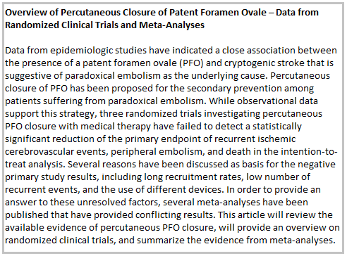 Three randomized trials are currently registered and recruiting patients, with the aim to contribute to our understanding of safety and efficacy of PFO closure when compared with medical therapy: