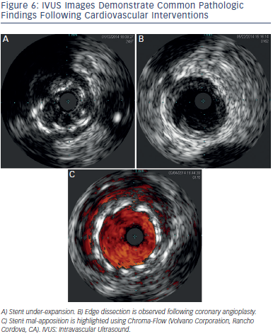 graphic miss, dissections, plaque prolapse, residual thrombus), and fine tuning performed. Figure 6 demonstrates some post intervention issues encountered during IVUS.