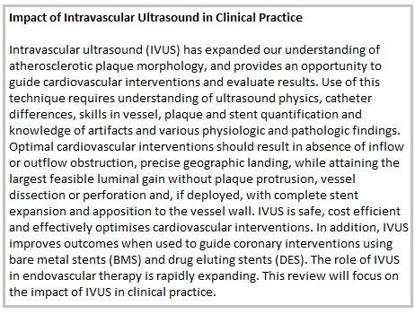 Literature regarding use of IVUS for endovascular interventions is scarce. Wada et al.60 reported a small case series of patients undergoing IVUS guided stent placement for subclavian artery disease. Short term results were good and long term outcomes were remarkable for absence of ISR over a 51 month median follow up. Contrast minimising strategies like the use of carbon dioxide digital subtraction and IVUS to guide interventions have been described for renal artery interventions,61 and for iliac artery CTO interventions.62
