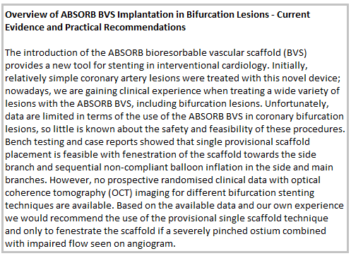 The ABSORB BVS is currently being used in daily clinical practice around the world. Unfortunately, very limited data are available about the use of the BVS in coronary bifurcation lesions. Several case reports have shown that treatment of bifurcation lesions and fenestration of the scaffold towards the side branch is feasible, which is supported by in vitro testing. However, all recommendations made in the treatment of coronary bifurcation lesions are not supported by any long-term clinical or in vivo data and are solely based on either expert opinion or limited in vitro data.