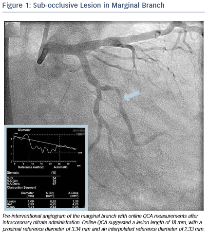 A 46-year-old male without cardiovascular history underwent coronary catheterisation for non-ST elevated myocardial infarction. Angiogram showed a sub-occlusive lesion in the marginal branch that was considered the culprit (see Figure 1), with an online measured interpolated reference diameter of 2.33 mm by Quantitative Coronary Angiography (QCA), while the lesion length was 18 mm.
