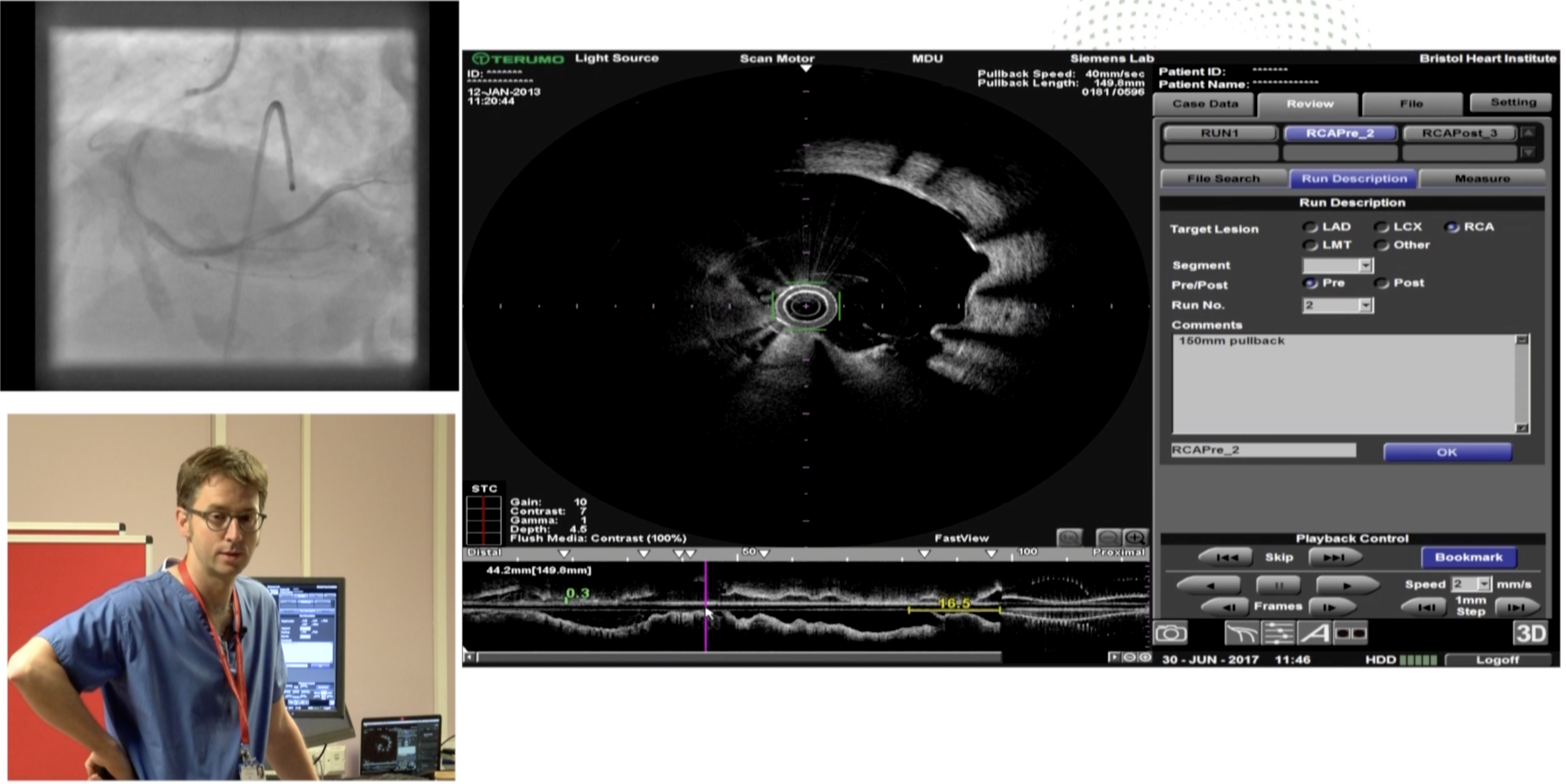 Case review run by Dr Tom Johnson, includes a patient with pre stenting with DES & BMS and restenosis. Review of the whole pullback showing ISR, neoatheroma, microvessels, lipid necrotic core and plaque rupture with thrombotic material at the occlusion site with macrophages. Stent invagination highlighted with OFDI. Second case illustrates the ability of OFDI to detect the media and intima bands of the coronary artery because of the high resolution. Thick cap fibroatheroma visualisation and identification of artefacts that can occur with OFDI.