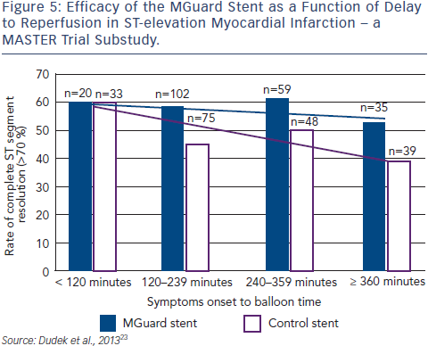 Clinical data using the MGuard was first published in 2010.21 At that time, data from the MAGICAL trial in Krakow showed that the use of MGuard EPS implantation during primary PCI for STEMI is safe and is associated with excellent results in terms of myocardial reperfusion parameters. Importantly, no thrombus protrusion was seen with MGuard. The early safety and efficacy of the MGuard stent was maintained during the long-term follow-up (mean follow-up of 38.7 ± 3.1 months).22 In a substudy of the MASTER trial, patients were divided into two groups. Those with symptom onset to balloon time ≤3 hours when thrombus is fresh, and >3 hours. Later presentation of MI showed a bigger difference between MGuard and control in terms of rate of resolution of STEMI and percentage of patients achieving TIMI 3 flow than in earlier presentation, an effect that becomes more pronounced over time (see Figure 5).22
