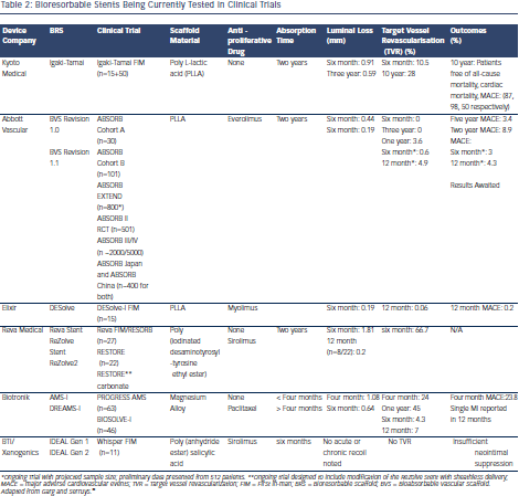 Table 2 shows the currently available BRS being tested in clinical trials. Poly L-lactic acid (PLLA) is the most commonly used material in BRS. PLLA is metabolised into carbon dioxide and water over a period of time (12–18 months), which is subsequently phagocytosed by the macrophages.23 ABSORB Bioabsorbable Vascular Scaffold (BVS) with a PLLA backbone releasing everolimus is the most widely investigated and the only approved bio-absorbable device (for de novo coronary lesions 2.0–3.8 mm in diameter).24 ABSORB Cohort A was an openlabel, prospective study of 30 patients with single de-novo lesions, which revealed acute recoil and late loss of scaffold area (-11.8 %) as measured by intravascular ultrasound (IVUS) (corresponding an