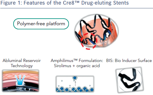 n products of absorbable biopolymers. A drug delivery system, Abluminal reservoir technology, utilises a formulation of sirolimus and a fatty acid (Amphilimus™) that enhances bioavailability and drug distribution to the entire vessel wall (see Table 1). In addition, the bio inducer surface, a second-generation integral pure carbon coating, is designed to accelerate stent endothelialisation and strut coverage that reduces the risk of thrombosis. The NEXT clinical trial demonstrated the efficacy and safety of Cre8,6and has suggested that this DES may be useful in cases with complex anatomy. This symposium aimed to demonstrate the use of Cre8 in patients with dual antiplatelet therapy constraints, to review the clinical issues related to patients undergoing PCI at high risk of restenosis and to understand PCI strategies for the above patients, through the discussion of two case studies.