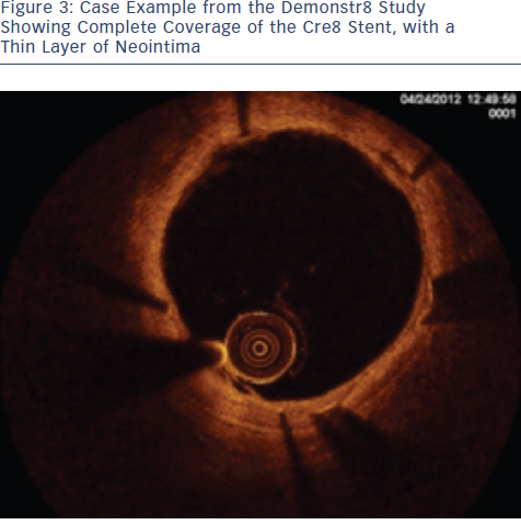 rthermore, heterogeneity of healing is commonly seen in DES.6 However, after complete drug elution, the Cre8 becomes a BMS and interacts with blood and tissue as a standard BMS. The Demonstr8 study therefore aims to show non-inferiority of the Cre8 in terms of stent strut coverage evaluated with optical coherence tomography (OCT) at three months after stent implantation compared with a well known BMS (Vision Multilink).7 It has been hypothesised that if endothelial coverage is comparable at three months, the Cre8 could be treated as a BMS at this stage; i.e. only aspirin would subsequently be needed.