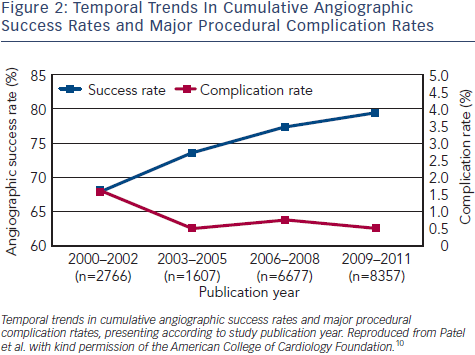 procedural complications being perforation (2.9 %, 95 % CI: 2.2 %–3.6 %) and contrast nephropathy (3.8 %, 95 % CI: 2.4 %–5.3 %). Overall, the success rate across the cohort was 77 %, with evidence that this has improved progressively year on year during the duration of the study (see Figure 2). The authors were able to study the impact of the retrograde approach in over 886 lesions (884 patients), and reported an similar overall MACE rate (3.1 %), driven predominately by periproceduralMI (2.8 %), but with a lower rate of procedural mortality (0.1 %). The success rate of the retrograde approach is comparable to that of the overall cohort at 79.6 %.