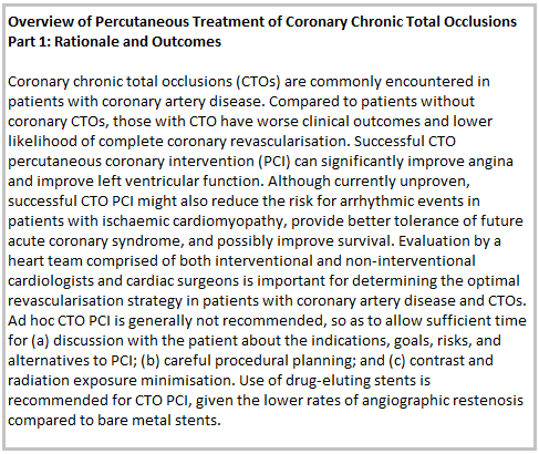 In the 2011 American College of Cardiology/American Heart Association PCI guidelines, CTO PCI carries a class IIA recommendation: “PCI of a CTO in patients with appropriate clinical indications and suitable anatomy is reasonable when performed by operators with appropriate expertise”.96 The 2010 European Society of Cardiology state that “similar to nonchronically occluded vessels, revascularisation of CTO may be considered in the presence of angina or ischaemia related to the corresponding territory”.97 In the 2012 statement on Appropriate Use Criteria for Coronary Revascularisation, coronary revascularisation was given a lower level recommendation compared with patients with 1–2 vessel CAD without a CTO in 5 of 18 assessed clinical scenarios.25 It is the authors’ opinion that the presence of a CTO should not have an impact on the revascularisation decision, as long as appropriate expertise in CTO PCI is locally available.