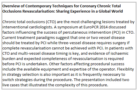 Dr Nicolaus Reifart from Frankfurt, Germany, gave a presentation focussing on CTO and complex PCI procedures. Before undertaking PCI, all risks need to be addressed, and other options such as optimal medical therapy should be considered. Case selection should also be tailored to level of experience of the operator. Dr Reifart suggested that a level C operator is one who has undertaken less than 500 PCIs and should only undertake PCI of simple lesions and simple bifurcations. A level B operator has undertaken 500–1000 PCIs and can therefore attempt more complex procedures such as complex bifurcations, moderate calcified lesions and some cases of CTO. Only a level A operator, i.e. one who has performed more than 1000 PCIs, including 300 CTO, might undertake complex cases such as long and highly calcified lesions and complex CTOs including retrograde. If a level C operator attempts a level A task, he/she is less likely to be successful and may cause harm to the patient.