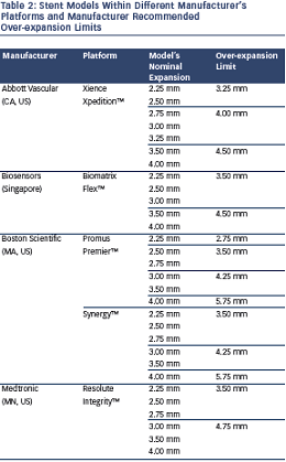 It is imperative that cardiologists are intimately familiar with the stents that they use. A differing range of stents occur within the various manufacturer product ranges (see Table 2). Understanding the differences between the stents within these product ranges is key to obtaining a good clinical outcome for the patient. This is becoming more important as the lesion complexity increases. For example, using a two-stent strategy at a bifurcation could potentially have a vastly different mechanical result depending on which product is chosen. If a 2.5 mm diameter product is brought from a side branch back into a much larger diameter main vessel, the final expansion in the proximal main vessel and stent cell diameter (and thus lumen achieved in the main vessel) will be very different than if a 3 mm or 4 mm version of the ‘same stent’ is deployed in the side branch instead. Understanding the implications of these choices is crucial. This is particularly pertinent when the left main stem (LMS) is being treated.